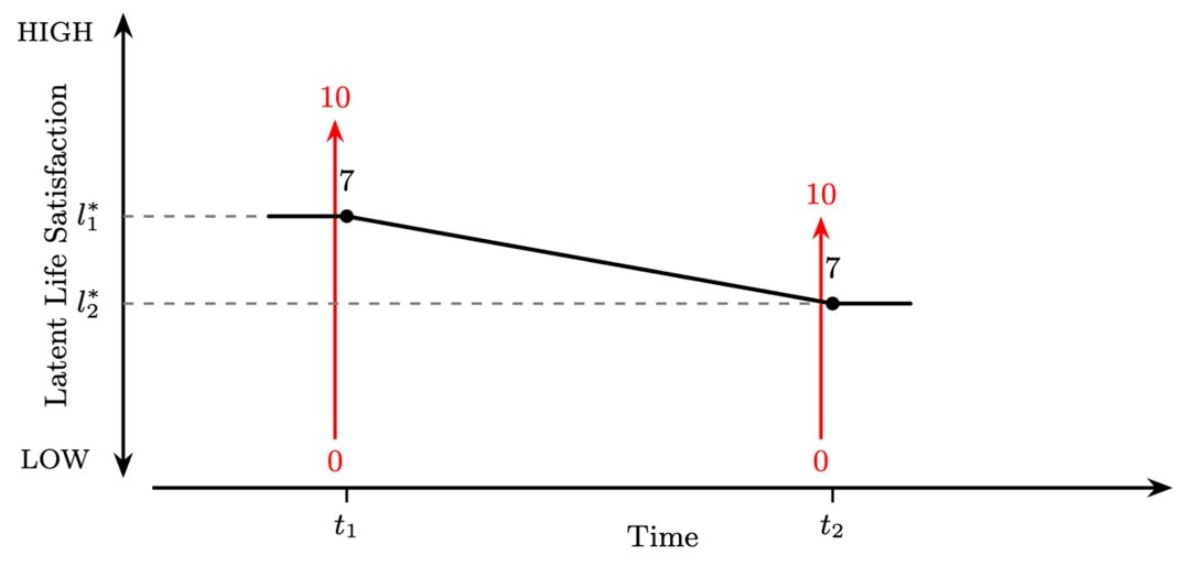 This cannot be interpreted as adaptation unless numbers are trusted more than subject testimony (in which case why are we doing subjective wellbeing research at all?). Our interviewee’s 7 today and her 7 in 2019 do not correspond to commensurate magnitudes of satisfaction. Her scale has shrunk, as depicted in the Figure below:
